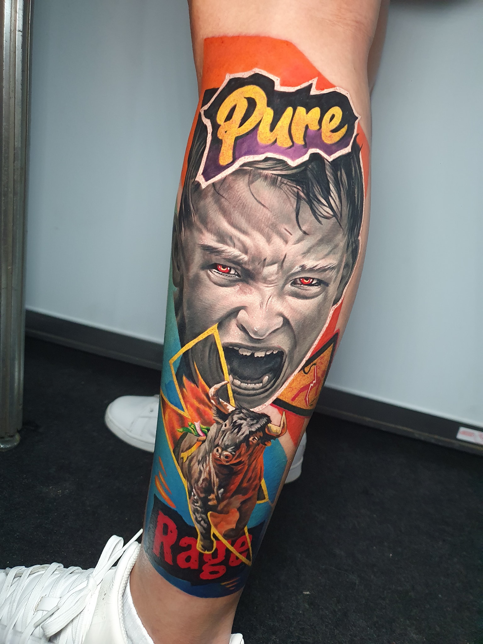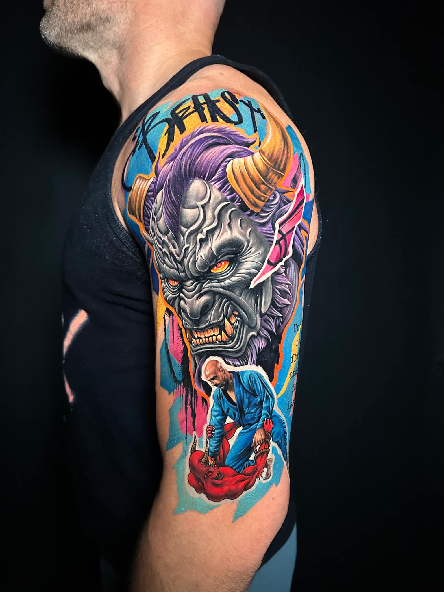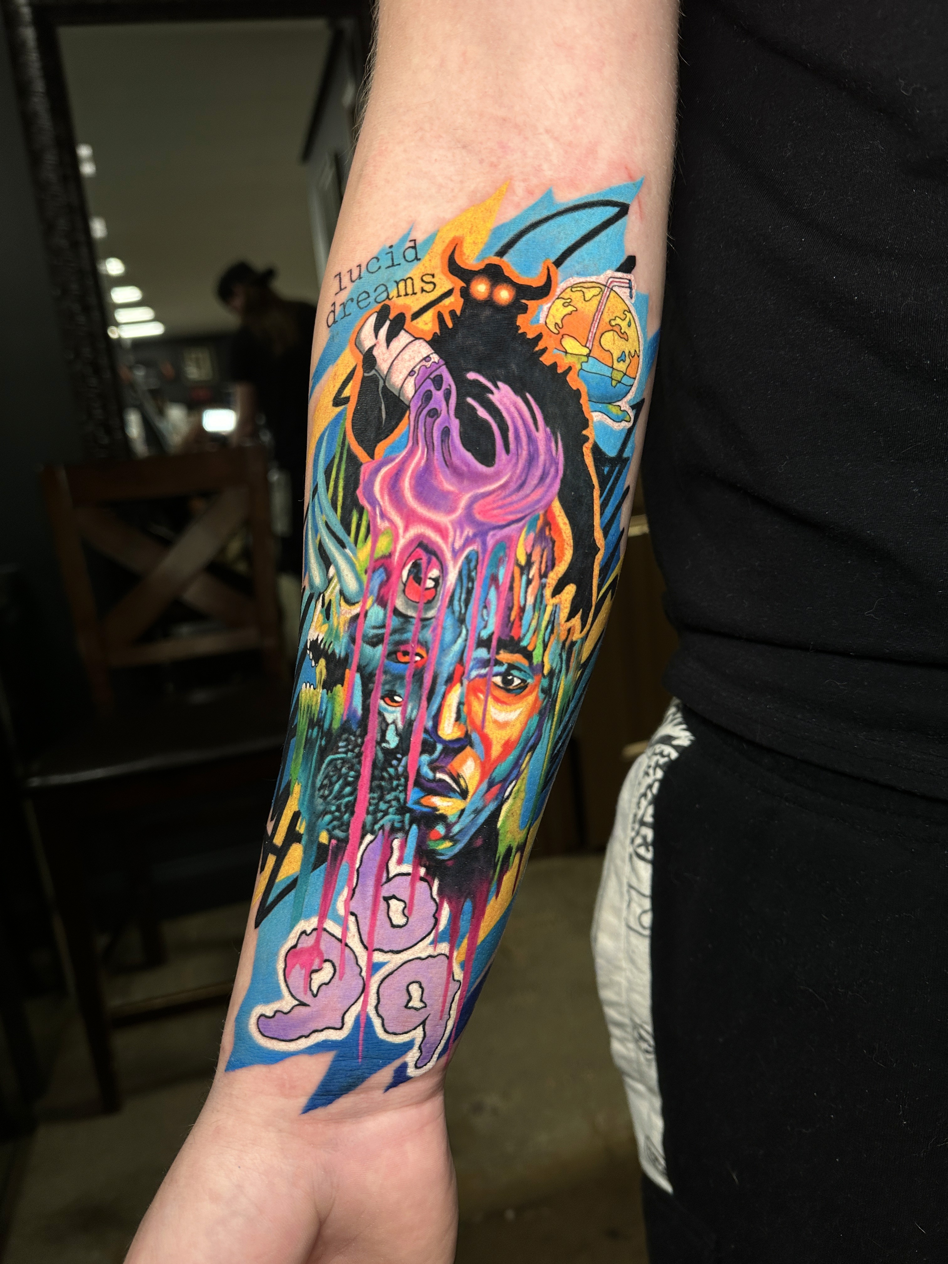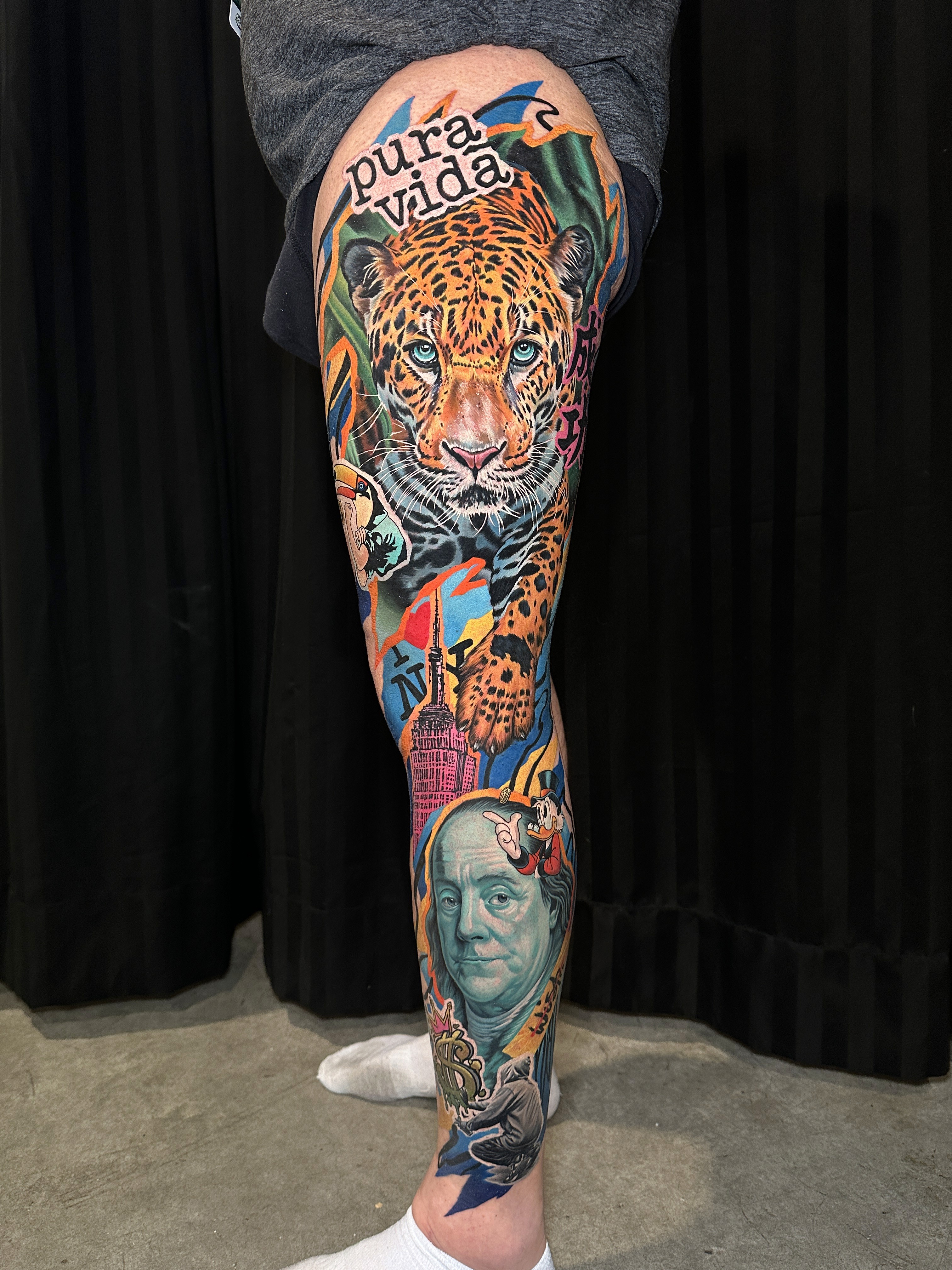 I specialize in Street Pop Art Tattooing, a signature style that blends realism, street art, and pop art using bold concepts and vibrant color palettes. I also work extensively with color and black & gray realism, as well as large-scale, multi-session pieces.